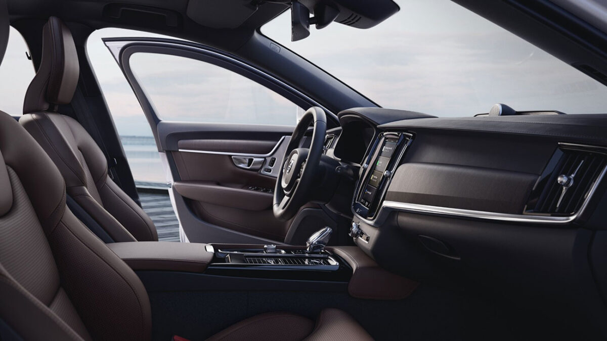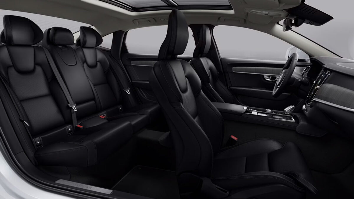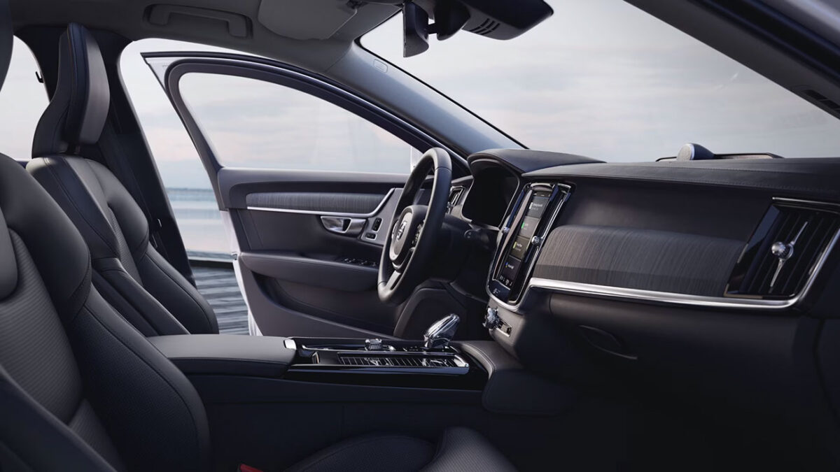 Nội thất Volvo S90 vơi chất liệu da và gỗ màu trầm phủ đầy bề mặt. Màn hình giải trí 9,7 inch, điều hòa không khí 4 vùng kèm chức năng lọc và khử bụi mịn. Trang bị sang trọng với âm thanh High-end 19 loa Bowers&Wilkins, ghế bọc da đục lỗ thông hơi, cửa sổ trời toàn cảnh…